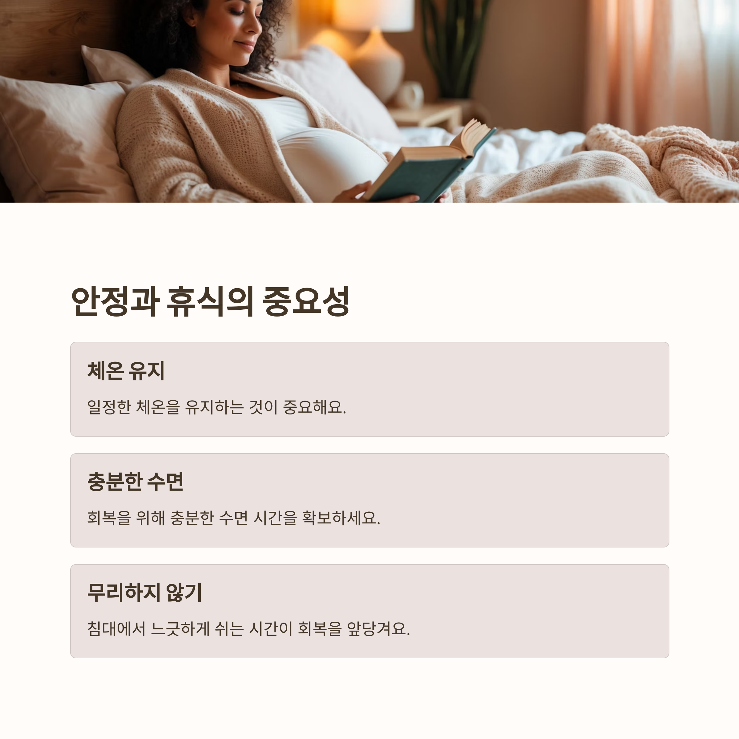 임신 중 감기에 걸리면, 뭐든 조심해야 하잖아요. 저는 가장 중요하게 생각한 게 바로 ‘무리하지 않는 것’이었어요. 체온을 일정하게 유지하고, 충분히 자고, 억지로 움직이기보단 침대에서 느긋하게 쉬는 시간. 이게 회복을 훨씬 앞당겨 주더라고요.