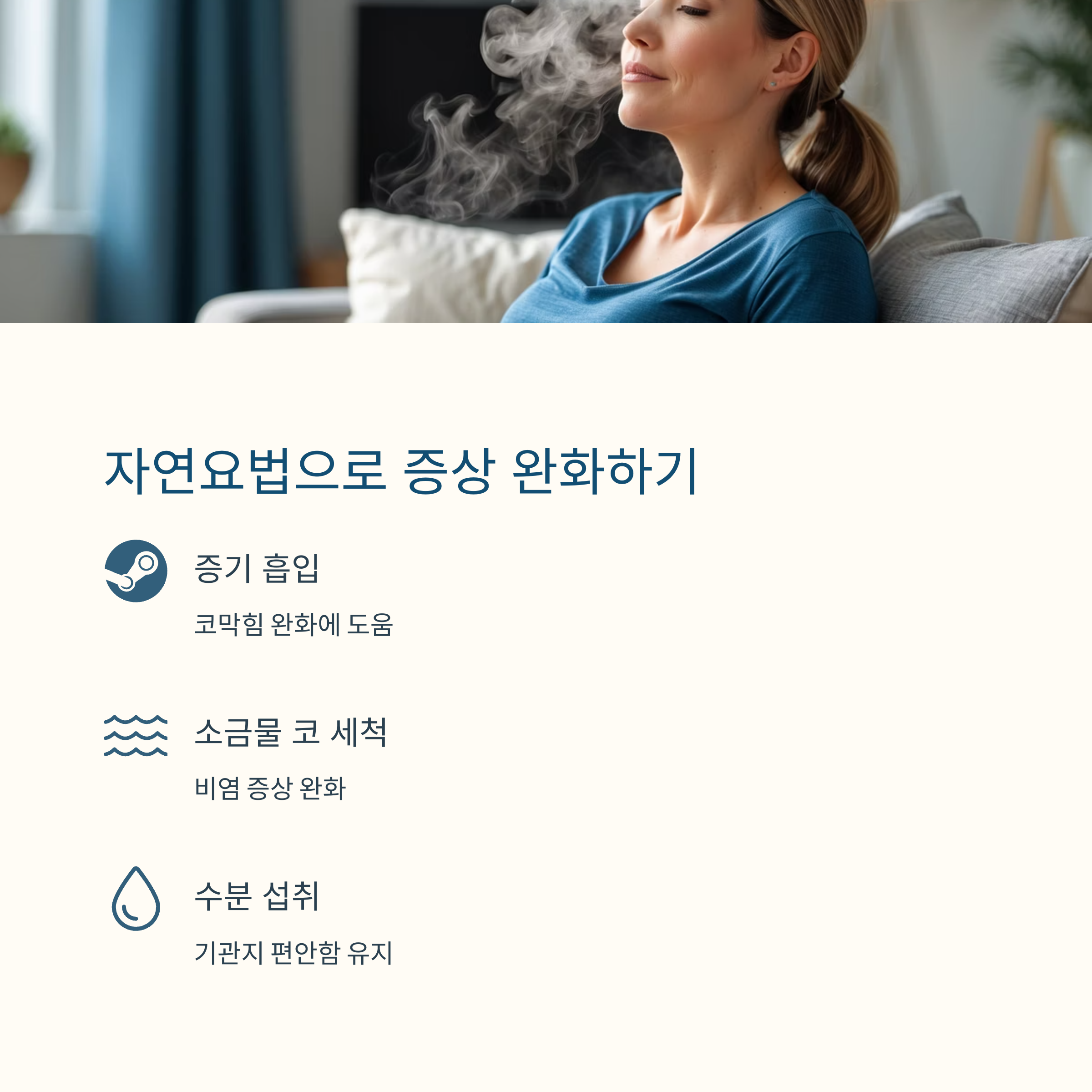 약 대신 사용할 수 있는 자연요법들도 있어요. 물론 완전한 치료는 아니지만, 증상 완화에는 꽤 도움이 된답니다. 예를 들면, 코막힘이 심할 땐 따뜻한 증기 흡입이나, 소금물로 코 세척하기 같은 방법이 있죠. 그리고 수분 섭취를 늘리면 기관지가 좀 더 편안해져요. 하지만 어떤 방법이든 자극이 없는 자연 요법을 선택하는 것이 기본입니다.